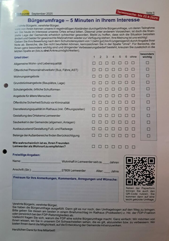 04.12.2025. Das Bürgerurteil in ihrer im Oktober durchgeführten Bürgerumfrage fiel gegenüber der letzten vor vier Jahren vorgenommenen Erhebung insgesamt schlechter aus, so FDP-Vorsitzender Harald Schöne. Nach einem Durchschnittswert 2021 von 3,3 fiel der Wert auf 3,7 zurück. Dass ist ein Ergebnis aus der Gesamtanalyse, das jetzt in der jüngsten öffentlichen Sitzung vorgestellt wurde.